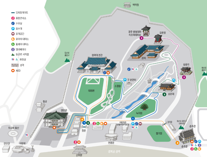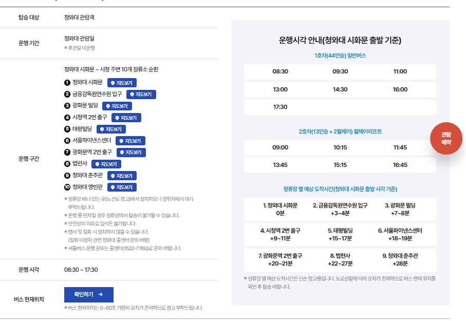- 청와대 관람 셔틀버스: 경복궁역 4번 출구 또는 동편 주차장 출발